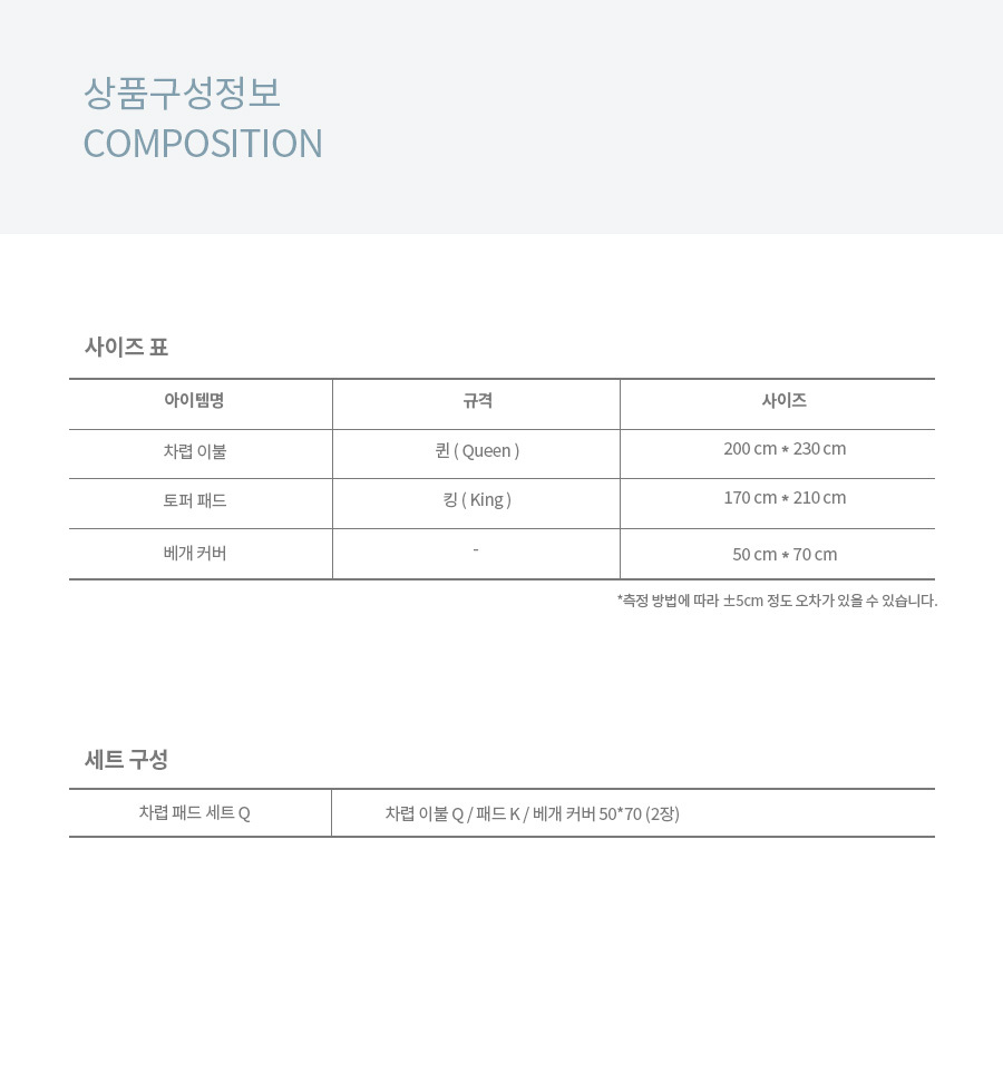 차렵 Q / 패드 K / 베개커버 50x70 단품입니다.