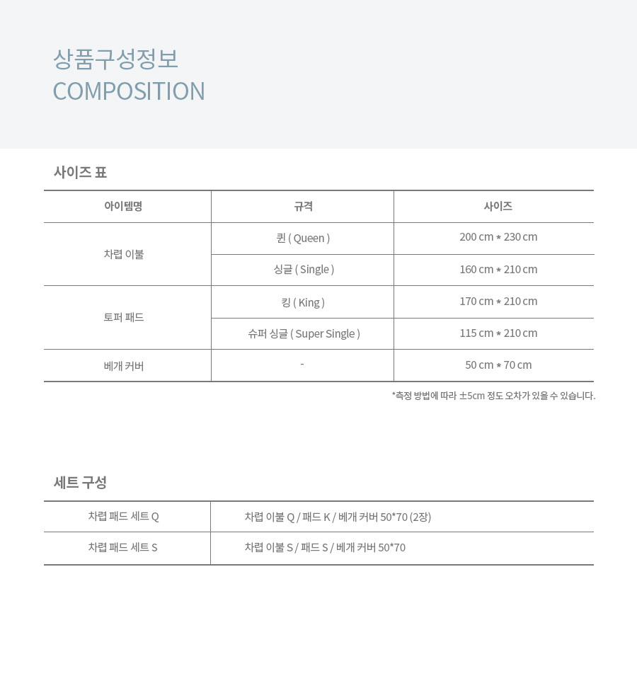 차렵 Q, S  / 패드 K, SS /  베개커버 50x70 단품입니다.